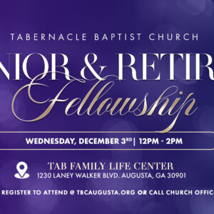 December Senior & Retiree Fellowship 03 Dec 12:00 pm Tabernacle Baptist Church Family Life Center1230 Laney Walker Blvd, Augusta, GA 30901