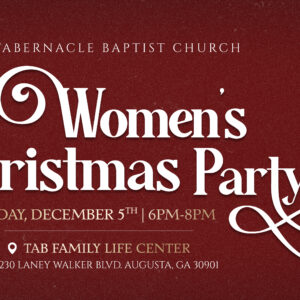 2025 Women’s Christmas Party 05 Dec 6:00 pm - 8:00 pm Tabernacle Baptist Church Family Life Center1230 Laney Walker Blvd, Augusta, GA 30901