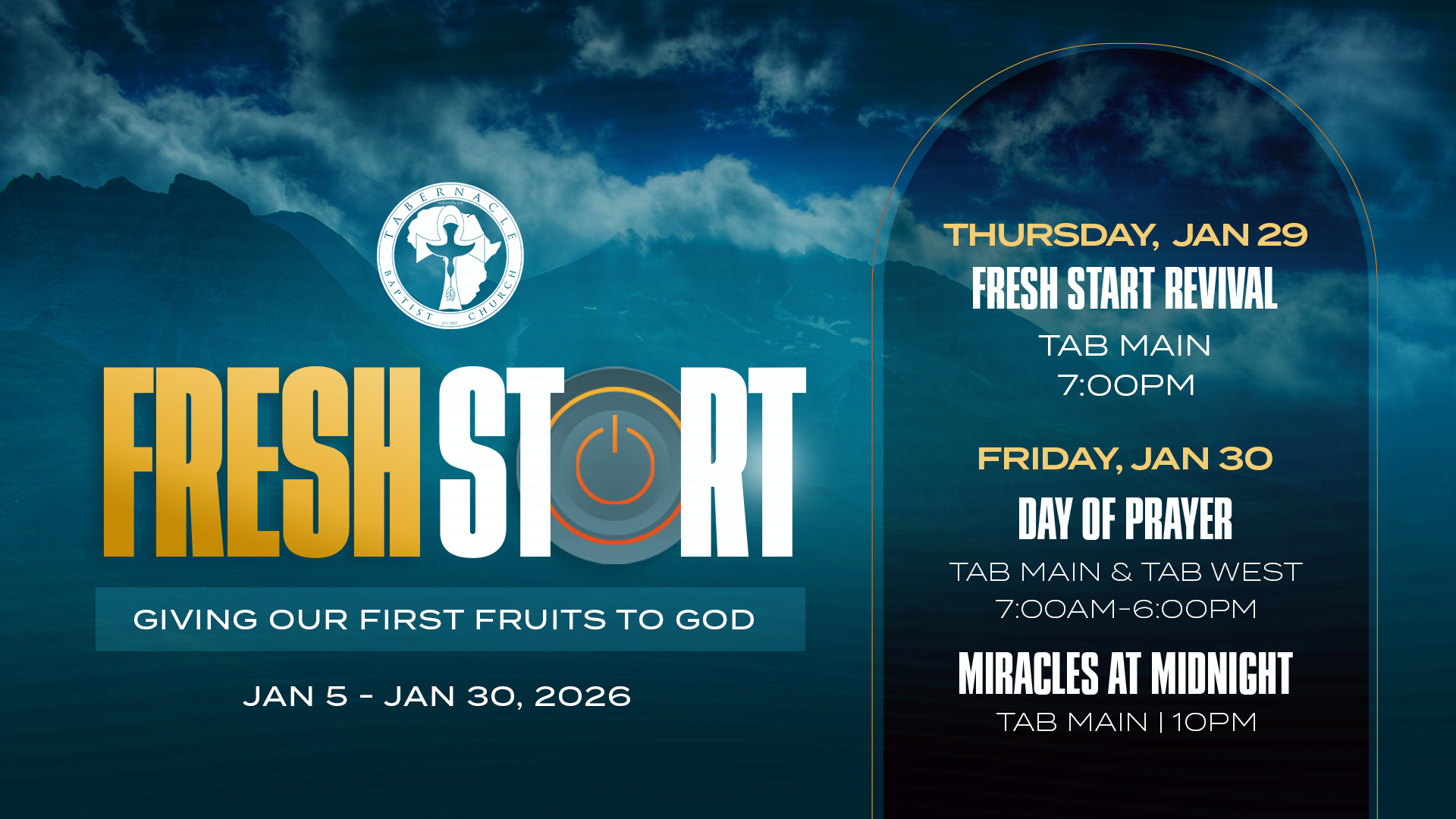 Fresh Start Fast Day of Prayer + Add to Google Calendar + iCal / Outlook export 00 days 00 hours 00 minutes 00 seconds Date Jan 30 2026 Time 7:00 am - 6:00 pm Location Tabernacle Main & Tabernacle West Share this event